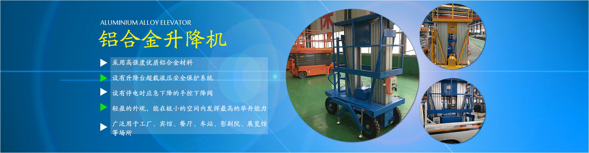 公司主要經(jīng)營:液壓貨梯、升降平臺、搬運車、叉車及各種液壓設(shè)備等。并承接升降平臺出租業(yè)務(wù)。 產(chǎn)品廣泛用于:港口、電力、鋼鐵、造船、石油化工、礦山...